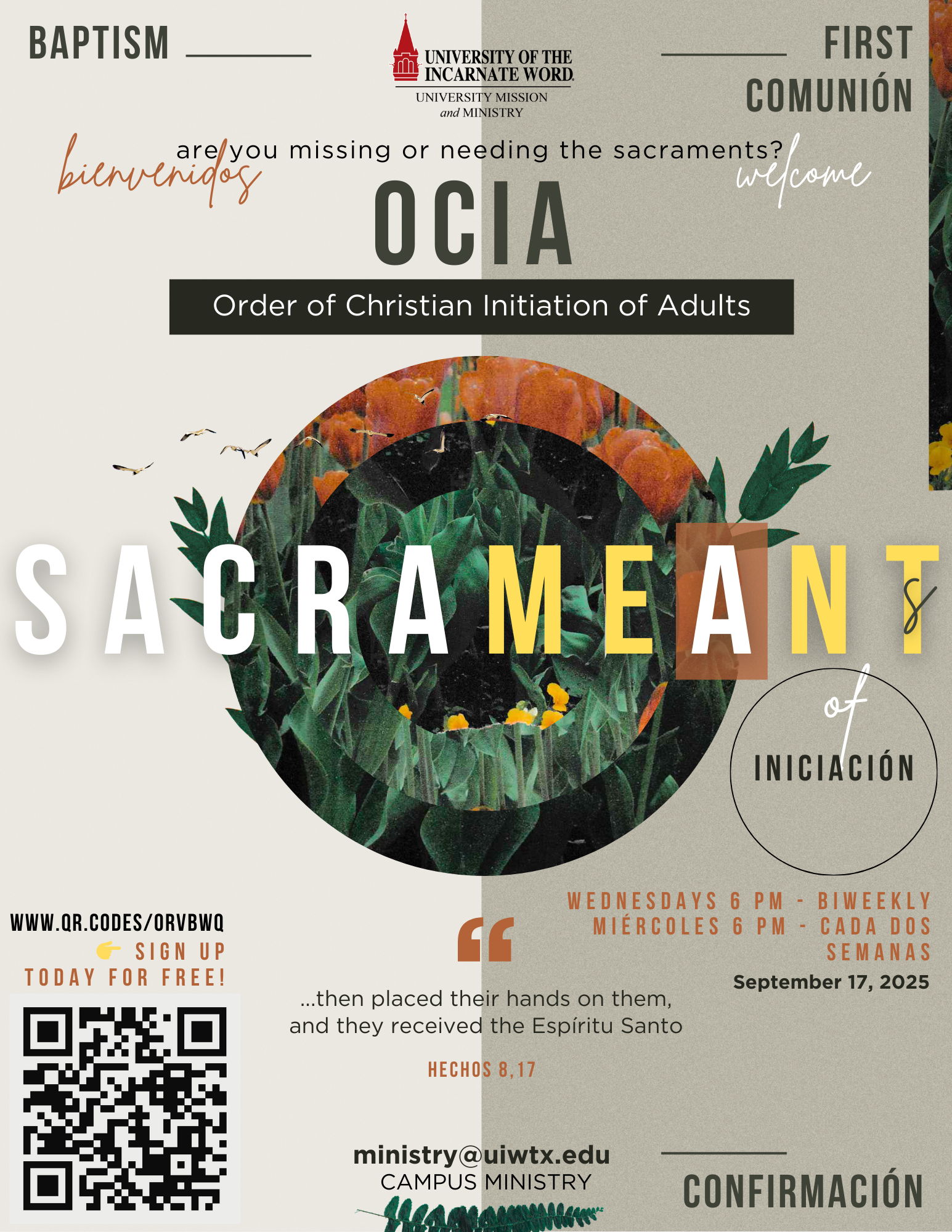 The University of the Incarnate Word's Campus Ministry invites you to take part in OCIA (Order of Christian Initiation of Adults)—a journey of faith and formation for those seeking to receive the Sacraments of Baptism, First Communion, and Confirmation. Nuestro programa, titulado “SACRAMEANT”, nos recuerda que los sacramentos son para ti. Ya sea que estés comenzando a explorar la fe católica o lleves tiempo en este camino, este es un espacio acogedor para profundizar tu relación con Cristo y con la Iglesia.