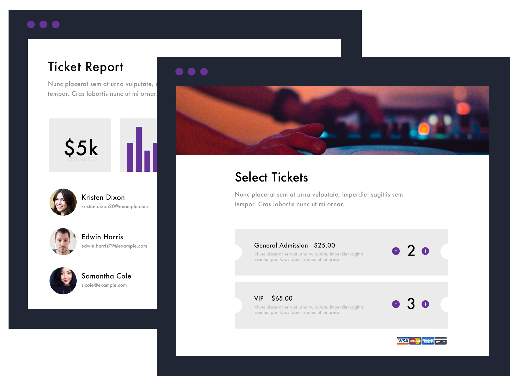 Once you've built your event website, customize your ticketing and event registration pages. EventCreate provides a cutting-edge suite of tools allowing you to manage all aspects of tickets sales, including unlimited tickets types, advanced ticket customizations, custom registration forms, coupons, add-ons, advanced tracking and a host of other tools to help make your event program a success and boost your sales. You want your event to sell out, and we're to help. Once you've started selling tickets, you'll be able to easily view your orders, track your ticket sales and manage your attendees--all via your real-time analytics dashboard.